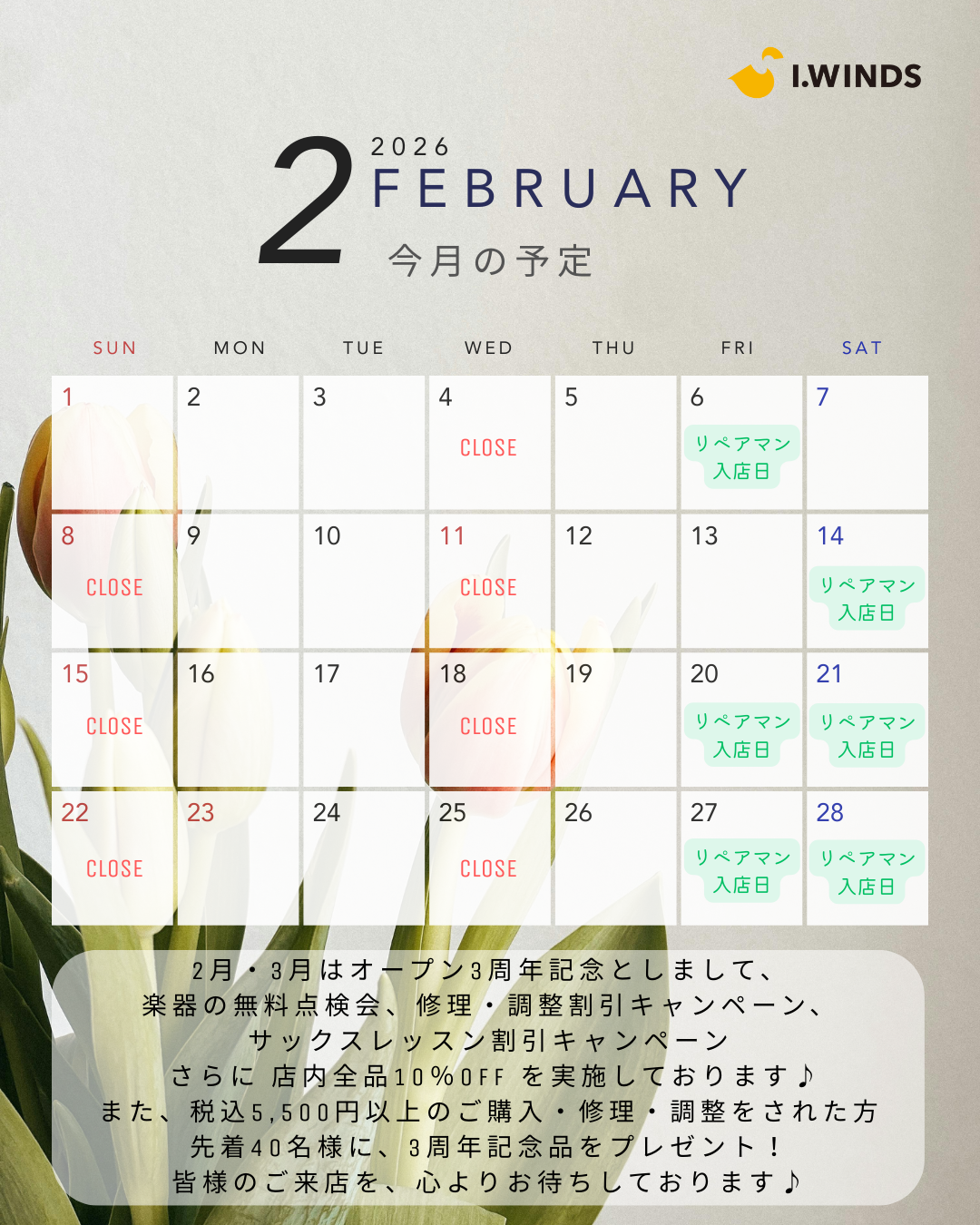 2026年2月の営業カレンダーができました!