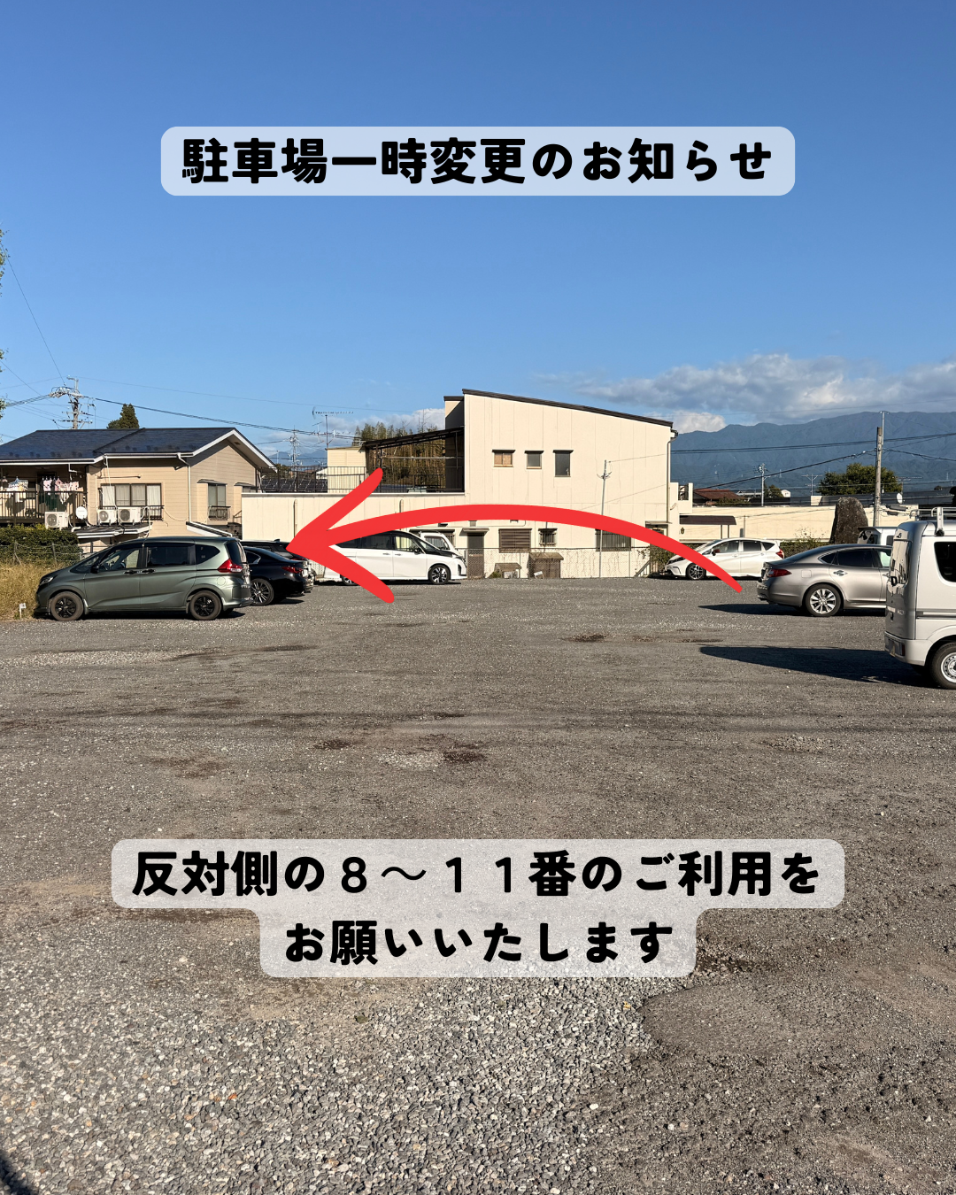 期間中は、反対側の8番~11番の駐車スペースをご利用くださいますようお願いいたします。
